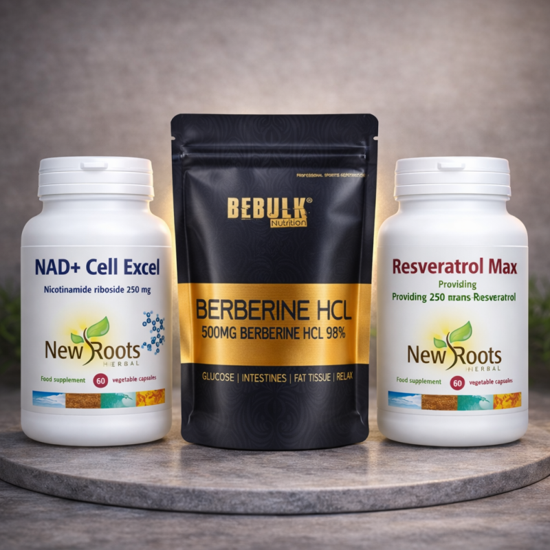 Berberine HCL 98% 500mg + Resveratrol Max 500mg + NAD+ Cell Excel