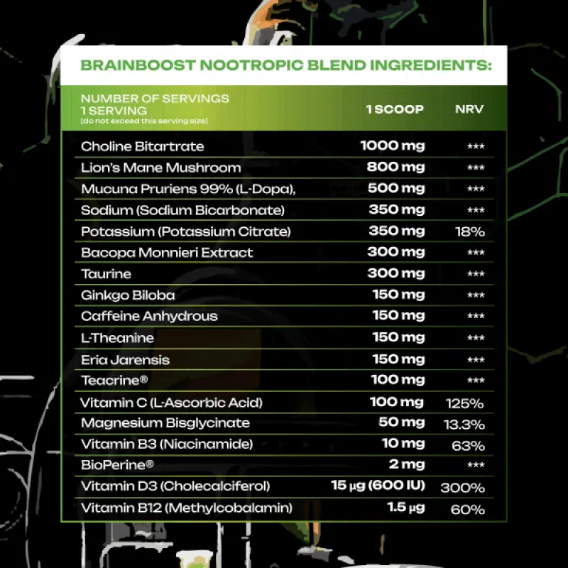 ✔️ L-Theanine - 150 mg Успокоява ума и увеличава концентрацията без нервност.