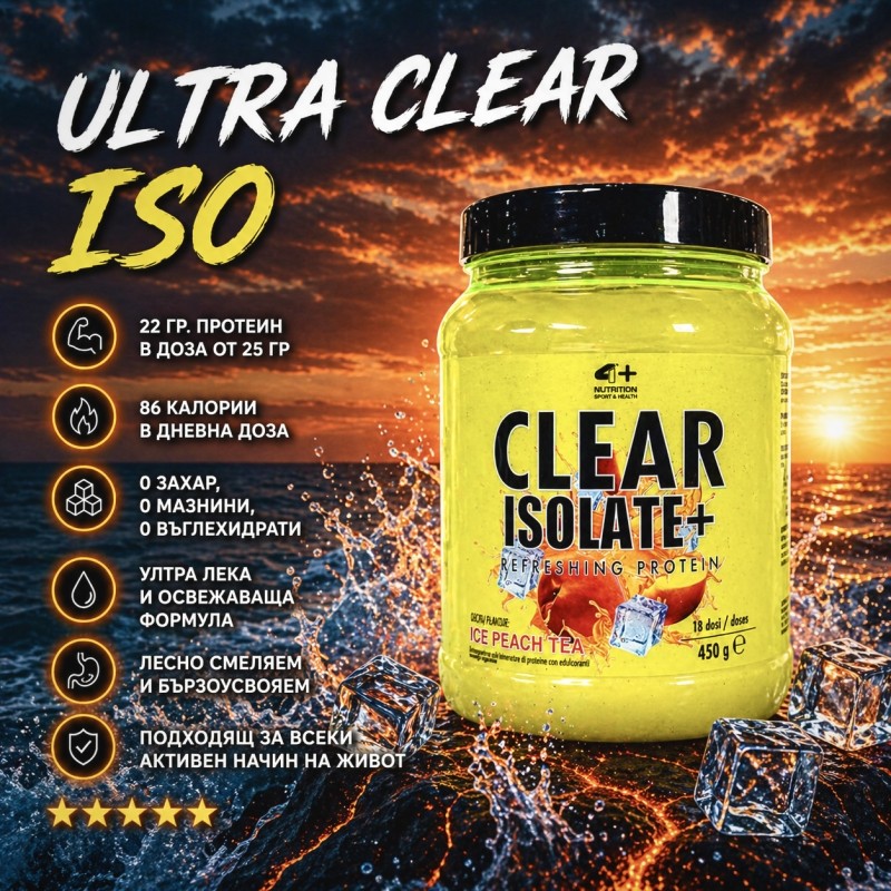 CLEAR ISOLATE+ е ново поколение протеинова формула, създадена за атлети и активни хора, които искат да се възстановяват бързо, да поддържат мускулна маса и да се наслаждават на вкусна и освежаваща напитка – без захар, мазнини и въглехидрати.