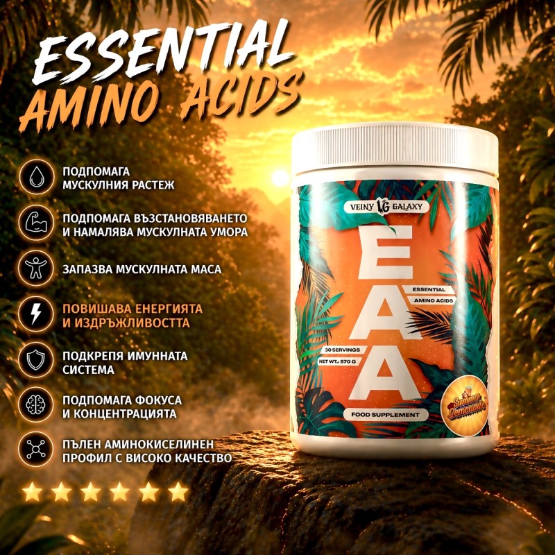 EAA 570 g е висококачествена формула с всички 9 незаменими аминокиселини (EAA), създадена за максимален мускулен растеж, издръжливост и бързо възстановяване. Продуктът съдържа висока доза левцин, BCAA, минерали, кокосова вода и електролити за оптимална хидратация и pump по време на тренировка. Идеален е за активни спортуващи и всеки, който иска да извлече максимума от тренировката си.